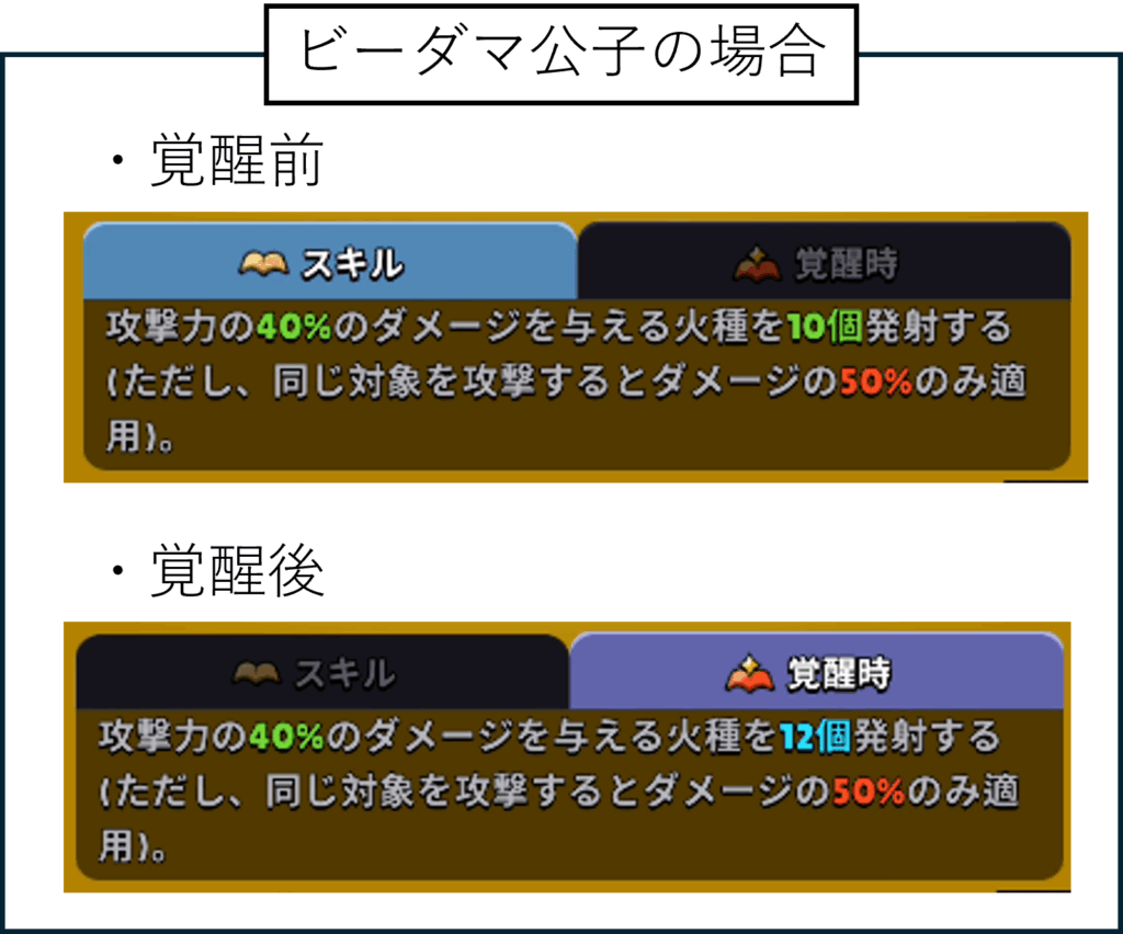 覚醒状態になると、ステータスが変わるだけでなく、スキルが強化される。