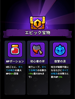 敵を倒すと宝箱をドロップすることがあります。宝箱を開けるとランダムで3つのアイテムが提示され、その中から1つ選択して獲得することができます。