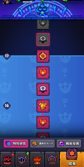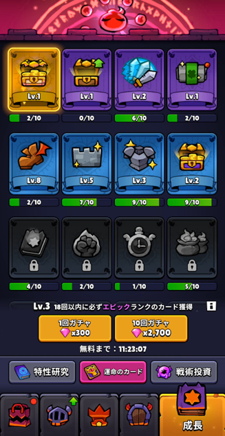 運命カードは全部で17枚あり、攻撃力や城の体力が上がるもの、レジェンドのドロップ率が上がるものなど、様々な効果がある。